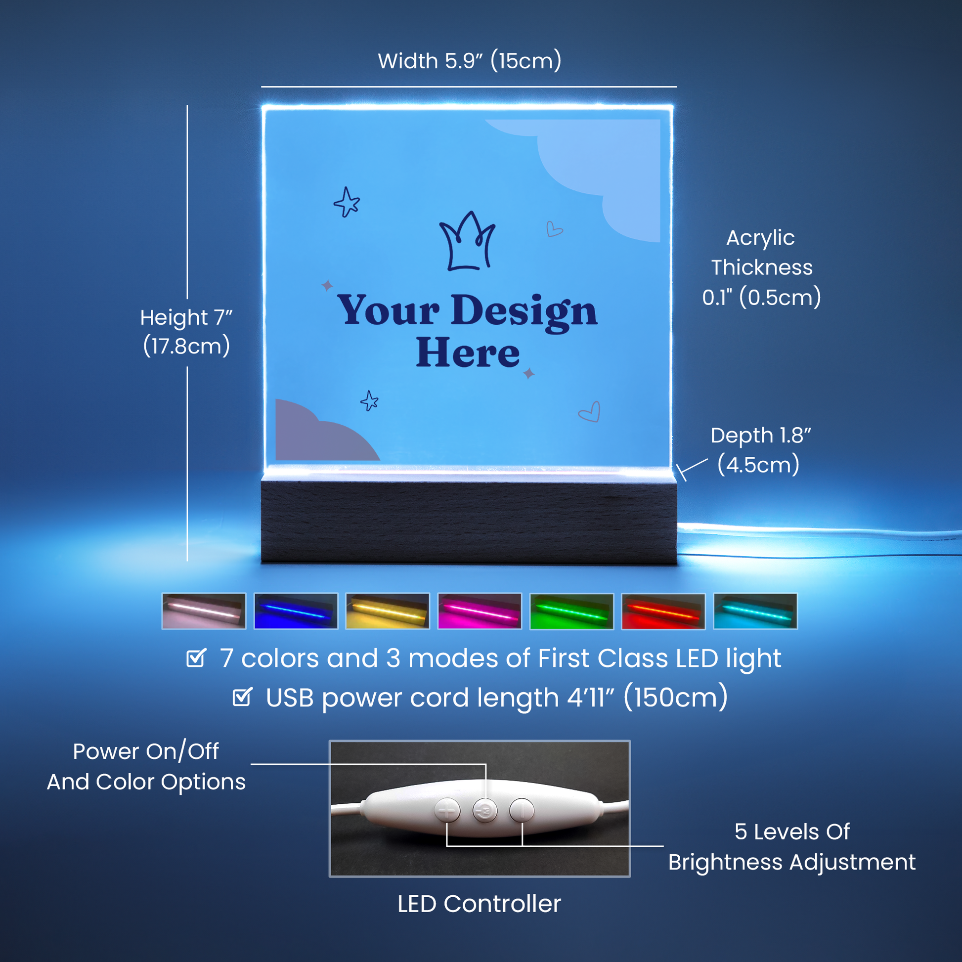 Your plaque will be crafted from premium acrylic with a professionally printed design for a polished look. It comes with a stylish wooden LED base, and you can choose between a USB plug-in option OR a cordless battery-operated option (requires 2 AAA batteries, not included). Both LED bases feature 7 vibrant colors, allowing the user to customize the lighting with various color changes and dynamic cycles.